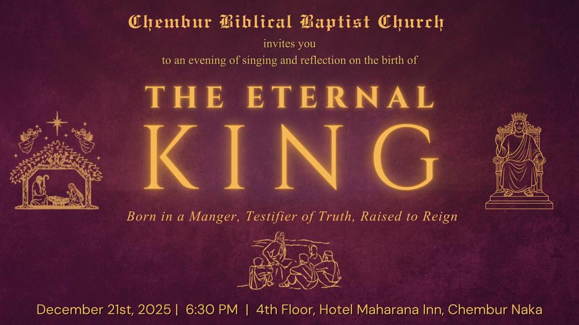 Dec 1, 2025Dec 24, 2025Chembur Biblical Baptist ChurchLeave a Comment on Christmas Celebration – 2025 Christmas Celebration – 2025 Join us for an evening to celebrate the birth of the Promised King! Share this:Tweet Related